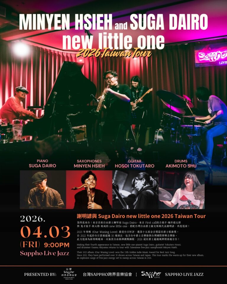 03 Apr 謝明諺與 Suga Dairo new little one 2026 Taiwan Tour + Late Night Jam 21:00 Sappho Live Jazz 台湾 场馆: Sappho Live Jazz… 查看详情 →